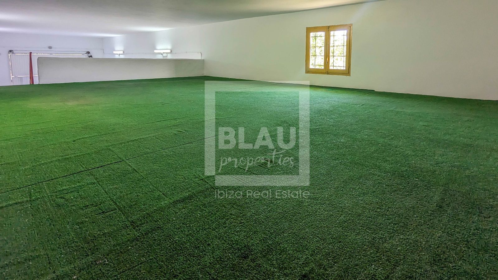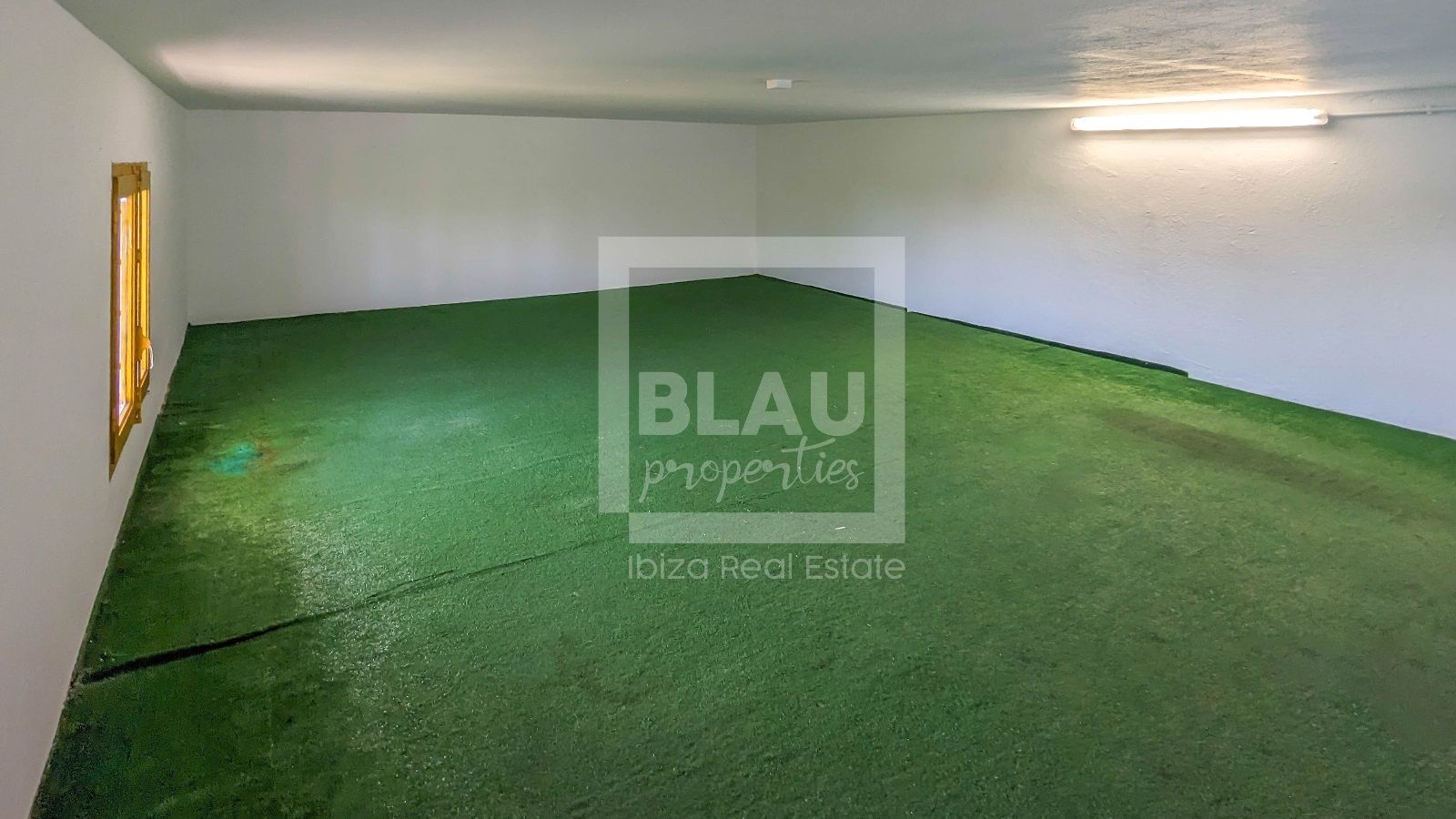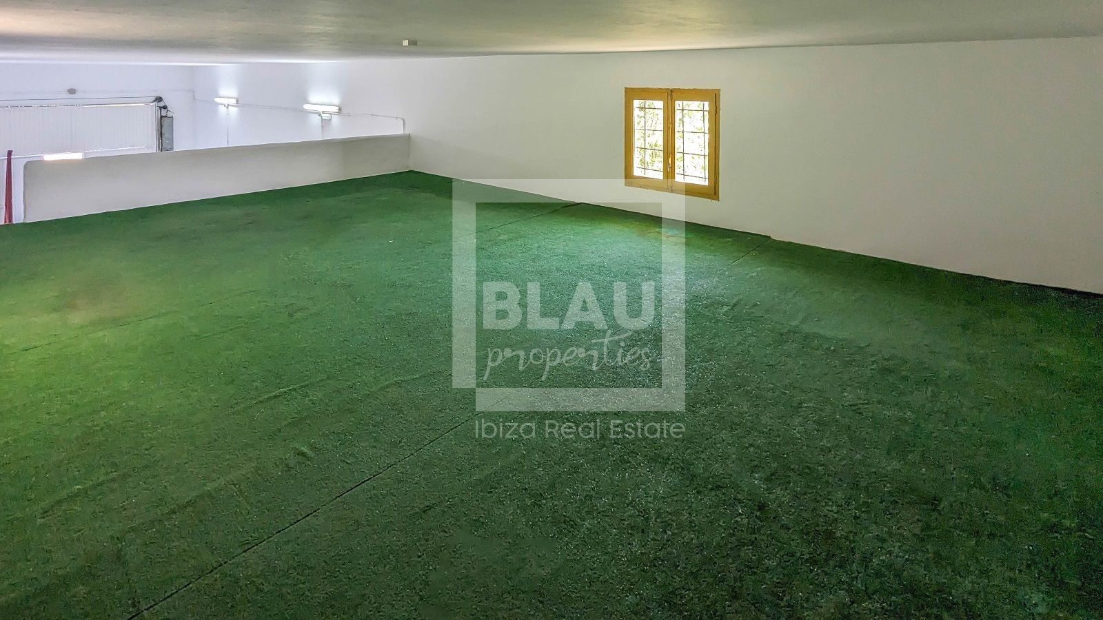 Die Halle hat eine Größe von 90m2, von denen 60m2 offen und mit hoher Decke sind und die restlichen 30m2 in Büros und einem Badezimmer aufgeteilt sind. Über diesen 30m2 gibt es einen Mezzanin mit Zugang über eine Treppe und einer Höhe von 1,5 Metern.