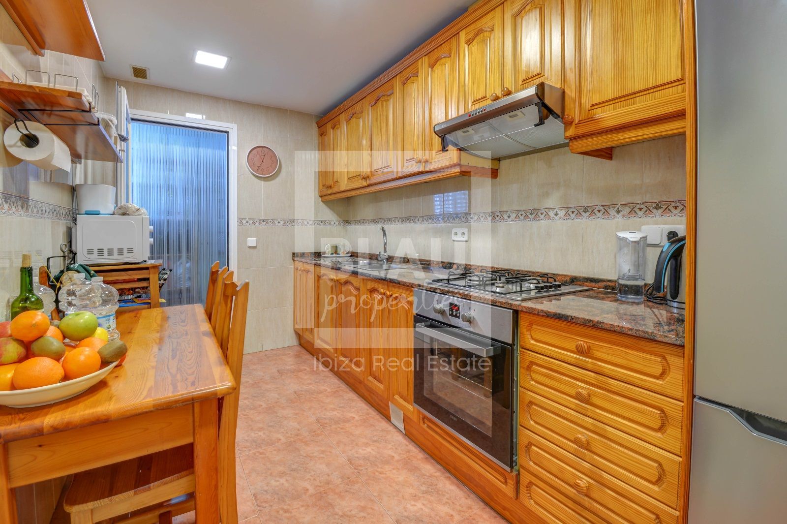 Die separate Küche mit Waschküche ist ein weiteres Highlight dieses Penthouse. Komplett ausgestattet mit massiven Holzmöbeln bietet sie einen funktionalen und ästhetischen Raum, um allen kulinarischen Bedürfnissen gerecht zu werden. Darüber hinaus gibt es Einbauschränke in den Zimmern, die ausreichend Stauraum bieten und zusätzlichen Platz sparen.